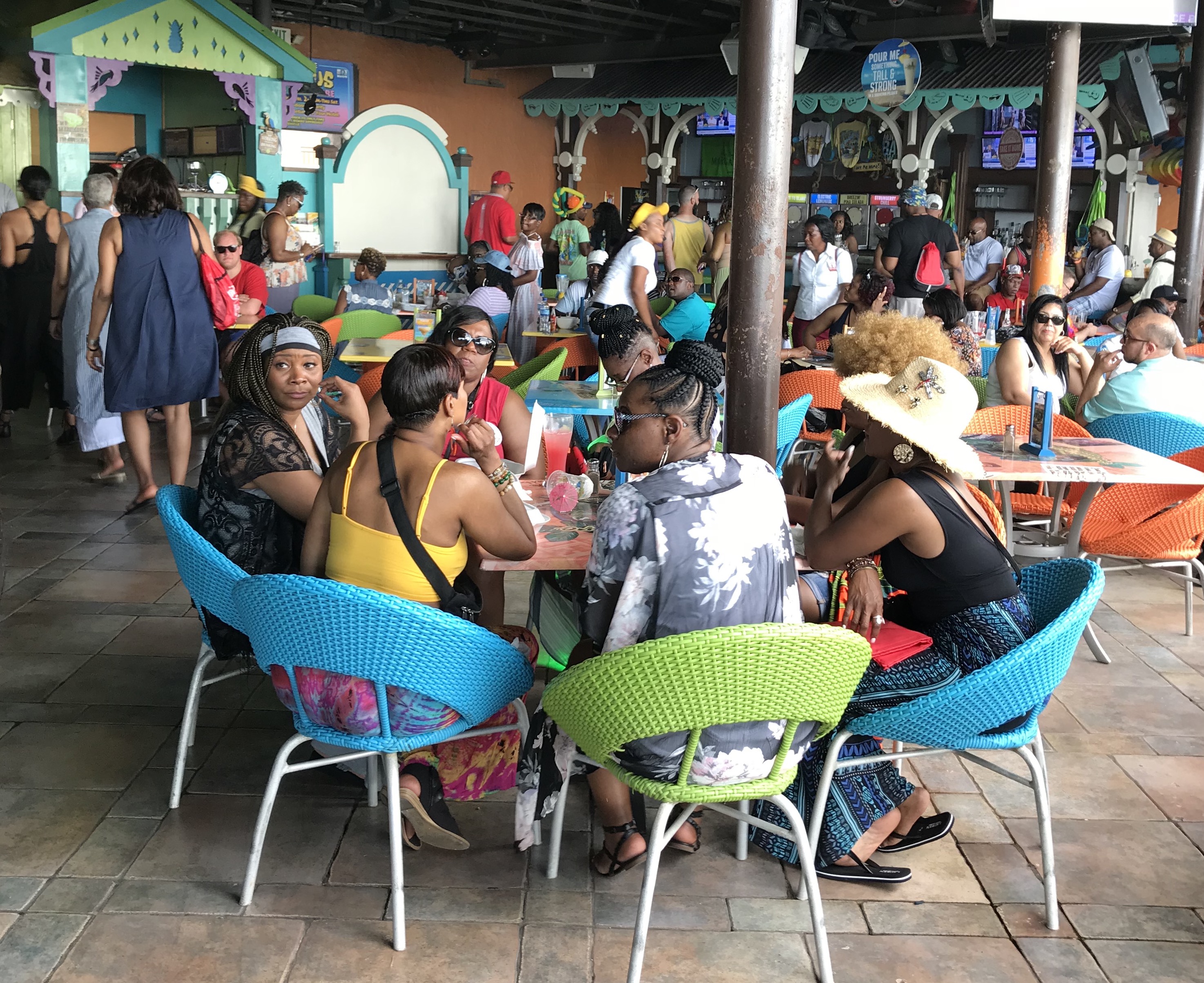 Jamaica, Jamaica! The Fantastic Voyage docked in Montego Bay, Jamaica for its first stop on land. And some folks took full advantage, heading out to partake in the sights, sounds and souvenirs that Jamaica offers. Cruisers headed to the beaches, the mountains and Margaritaville, the restaurant chain made famous by singer Jimmy Buffett. The Wolf Pack – a group of friends around the country who organize both each year’s cruise travel and events and parties during the cruise – hosted a party at Margaritaville. It was good, festive fun for the many members and cruisers who headed there off the ship.