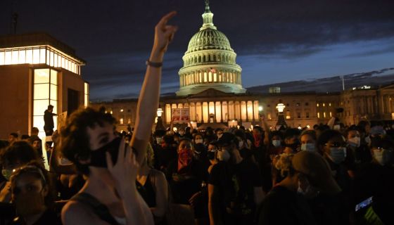 Protesters gather outside the Capitol in Washington, DC, on May 29, 2020 during a demonstration over the death of George Floyd, a black man who died after a white policeman kneeled on his neck for several minutes. – Demonstrations are being held across the US after George Floyd died in police custody on May 25. (Photo by Eric BARADAT / AFP) (Photo by ERIC BARADAT/AFP via Getty Images) photography,horizontal,usa,adult,law,justice – concept,men,death,politics,washington dc,kneeling,police force,conflict,protest,protestor,politics and government